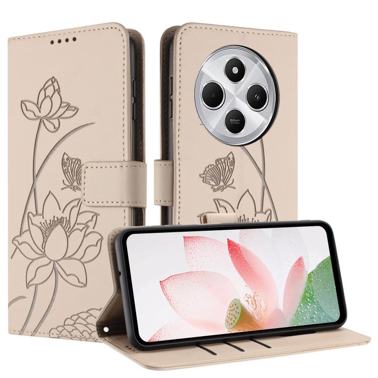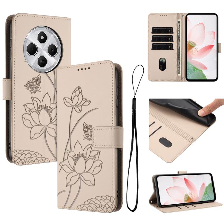 For Redmi 14C 4G / A4 / 14R 5G / Poco C75 Lotus Embossed Leather Phone Case with Lanyard(Beige)