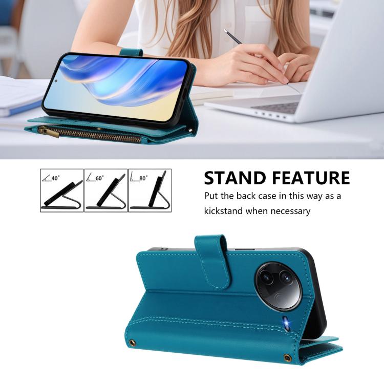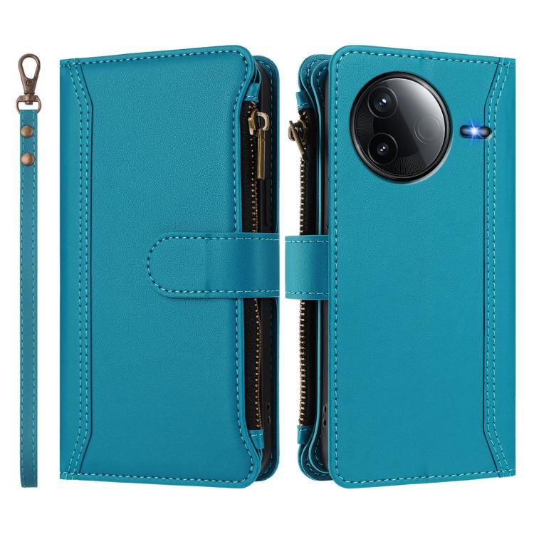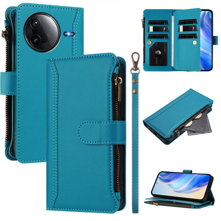 For Redmi K80 / K80 Pro Magnetic Closure 9 Card Slots Zipper Leather Case with Hand Strap(Turquoise)