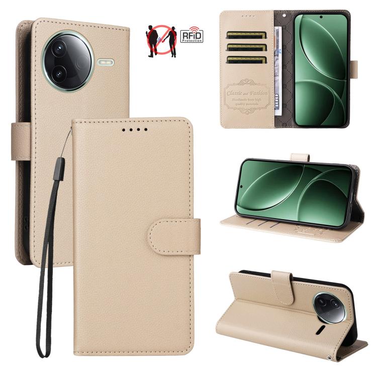 For Redmi K80 / Poco F7 Pro Litchi Texture RFID Blocking 3-Card Wallet Leather Phone Case(Beige)
