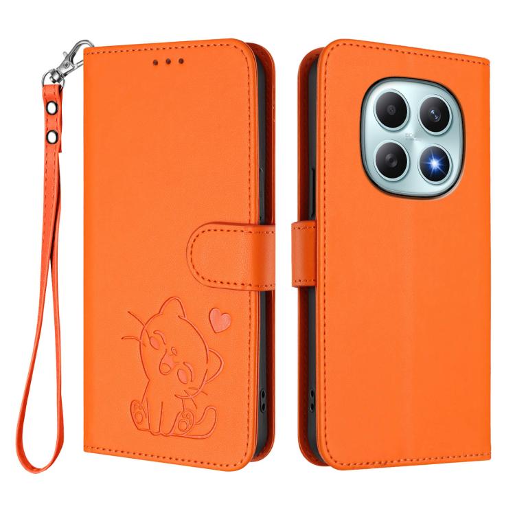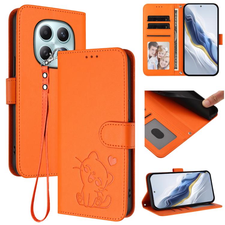 For Redmi Note 15 5G Global 164mm Embossed Heart Cat Leather Phone Case with Hand Strap(Orange)