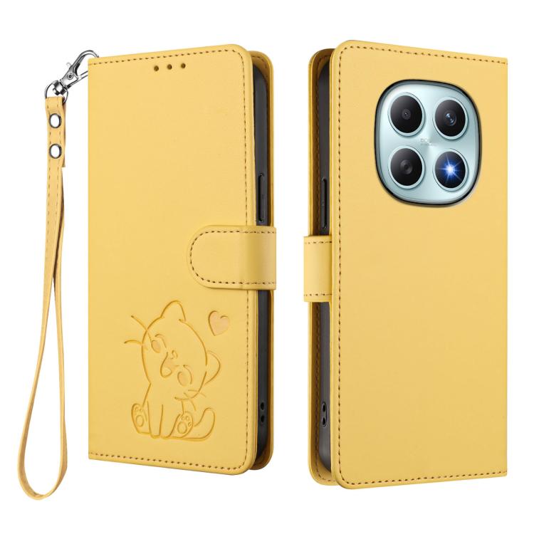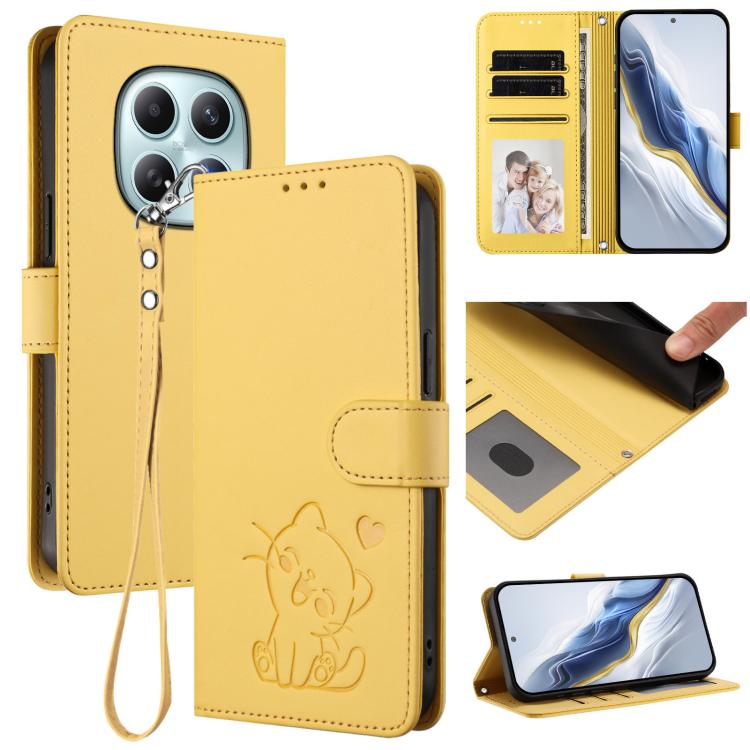 For Redmi Note 15 5G Global 164mm Embossed Heart Cat Leather Phone Case with Hand Strap(Yellow)