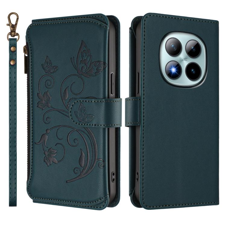 For Redmi Note 15 Pro+ 5G Global 163.3mm Butterfly Love Flower Multi-card Zipper Wallet Leather Phone Case(Dark Green)