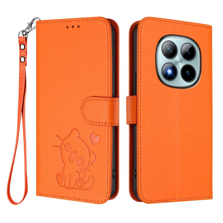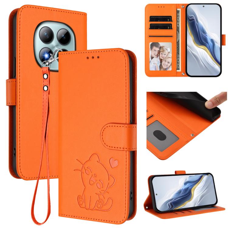 For Redmi Note 15 Pro+ 5G Global 163.3mm Embossed Heart Cat Leather Phone Case with Hand Strap(Orange)