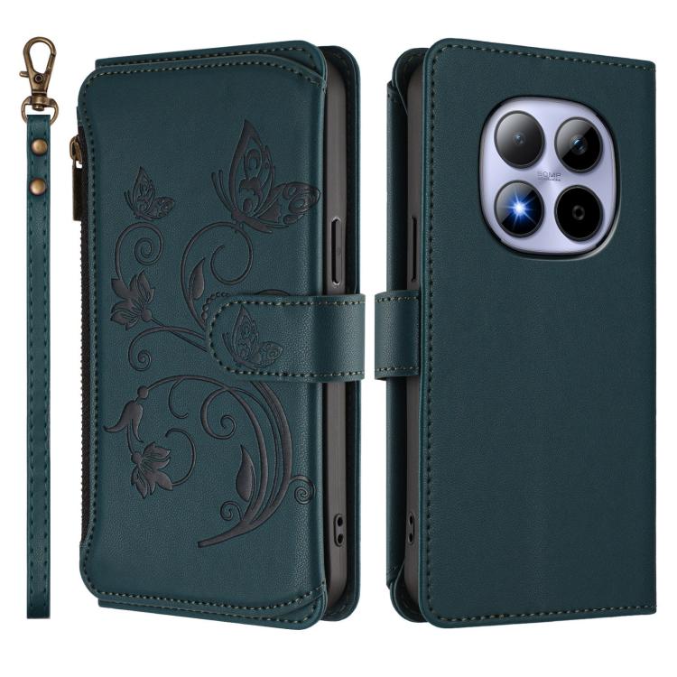 For Redmi Note 15 Pro 5G Global 163.6mm Butterfly Love Flower Multi-card Zipper Wallet Leather Phone Case(Dark Green)