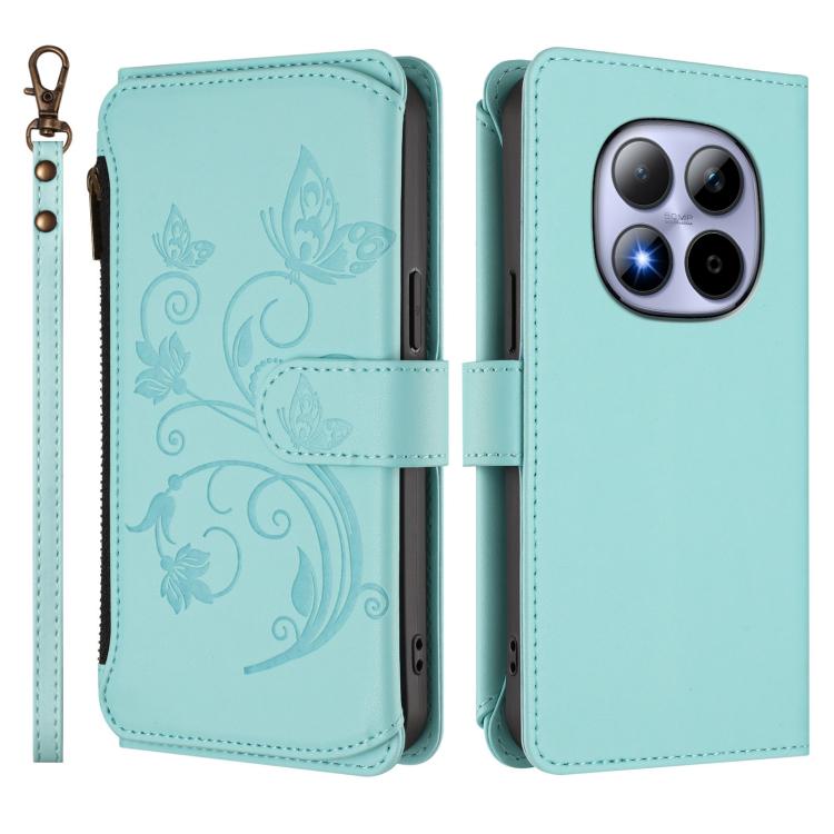 For Redmi Note 15 Pro 5G Global 163.6mm Butterfly Love Flower Multi-card Zipper Wallet Leather Phone Case(Mint Green)