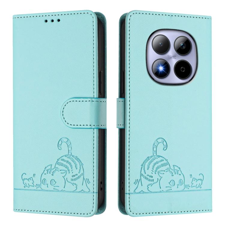 For Redmi Note 15 Pro 5G Global 163.6mm Cat Rat Embossed Pattern RFID Leather Phone Case with Lanyard(Mint Green)