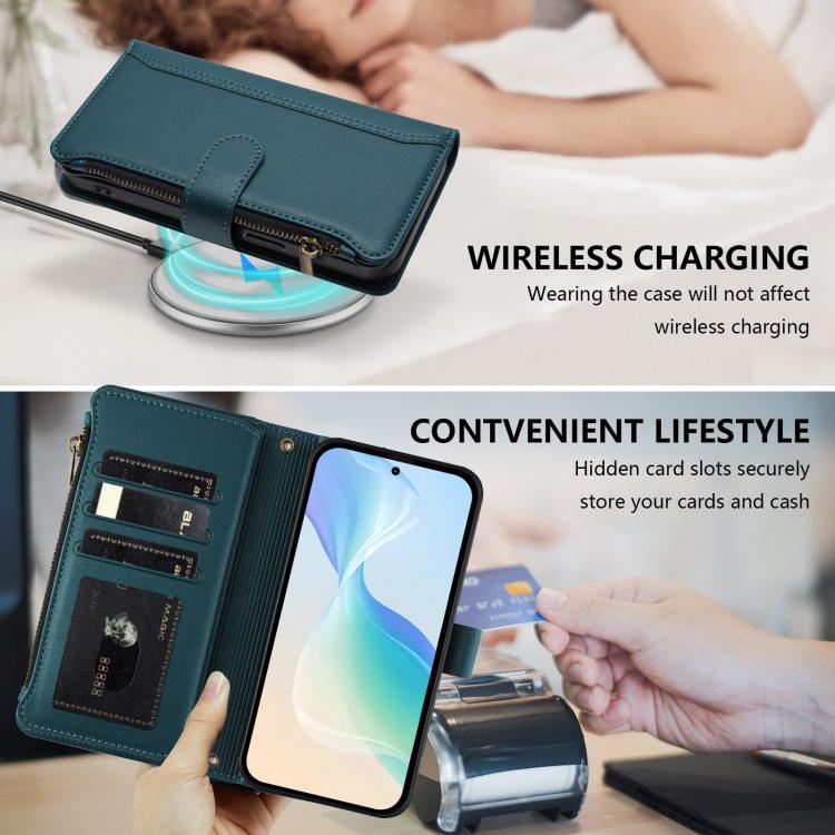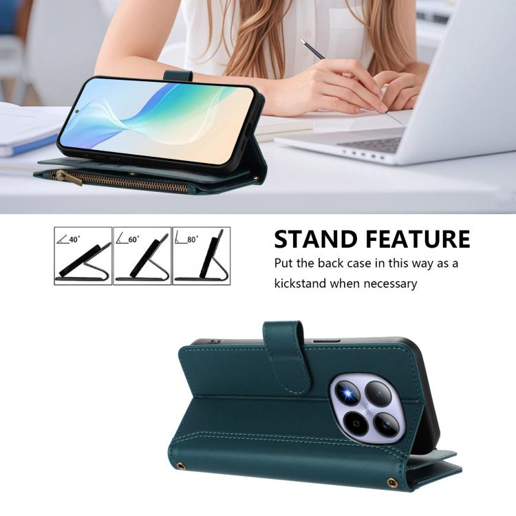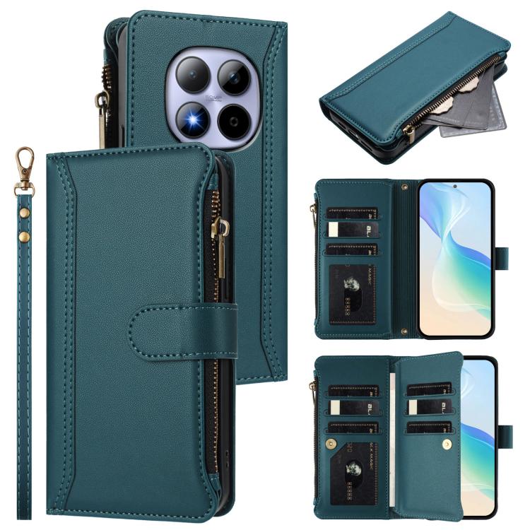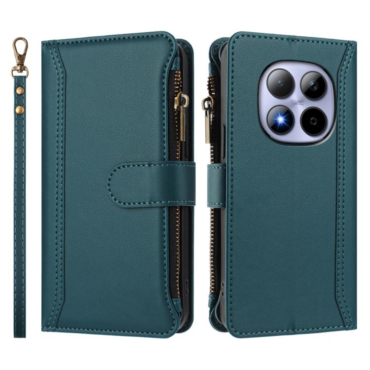 For Redmi Note 15 Pro 5G Global 163.6mm Magnetic Closure 9 Card Slots Zipper Leather Case with Hand Strap(Dark Green)