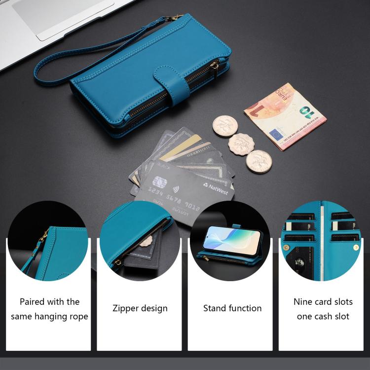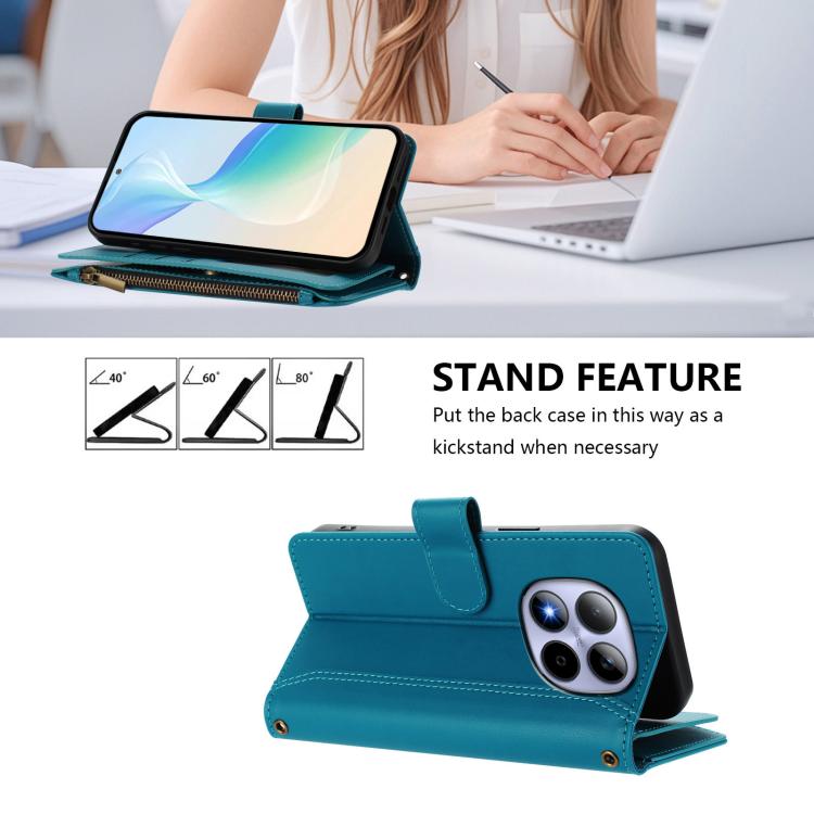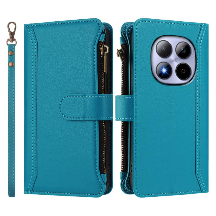 For Redmi Note 15 Pro 5G Global 163.6mm Magnetic Closure 9 Card Slots Zipper Leather Case with Hand Strap(Turquoise)