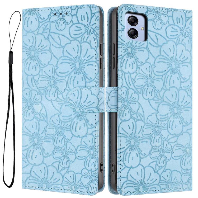 For Samsung Galaxy A04e Cherry Blossoms Embossed Leather Phone Case(Light Blue)