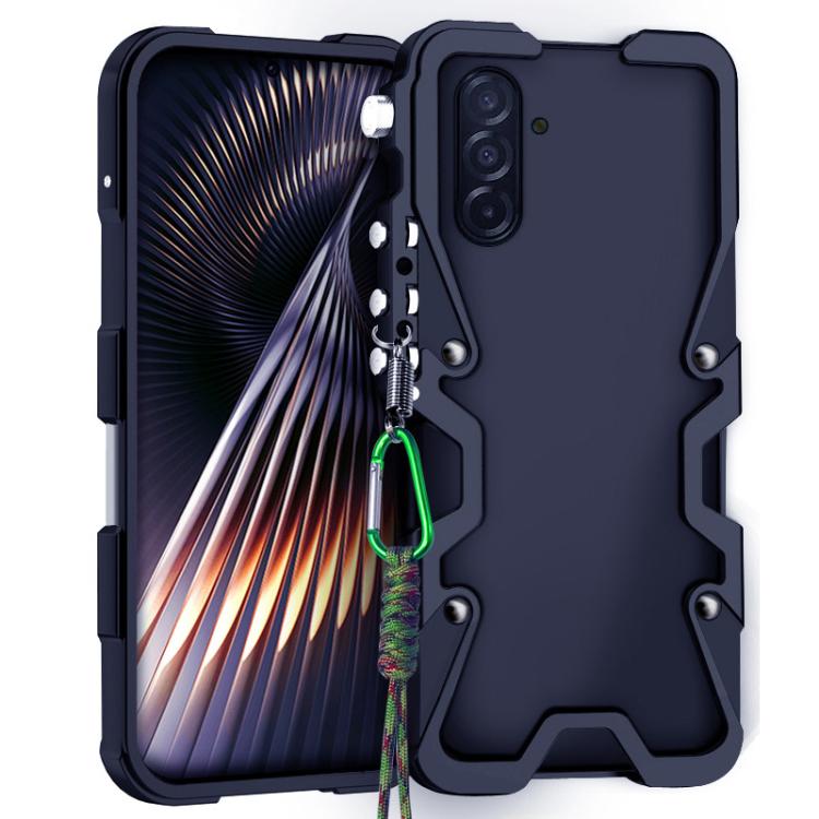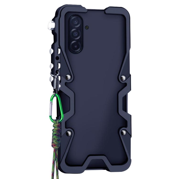 For Samsung Galaxy A26 5G Trigger Design Hollow Metal Frame Phone Case with Lanyard(Black)