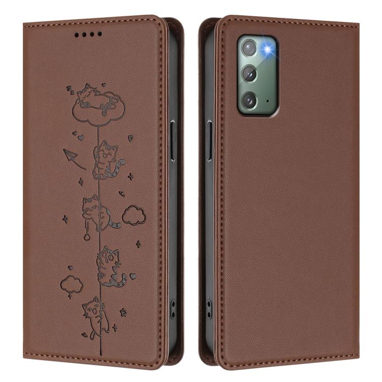 For Samsung Galaxy Note20 Cute Cats Embossed Magnetic RFID Vegan Leather Phone Case(Brown)