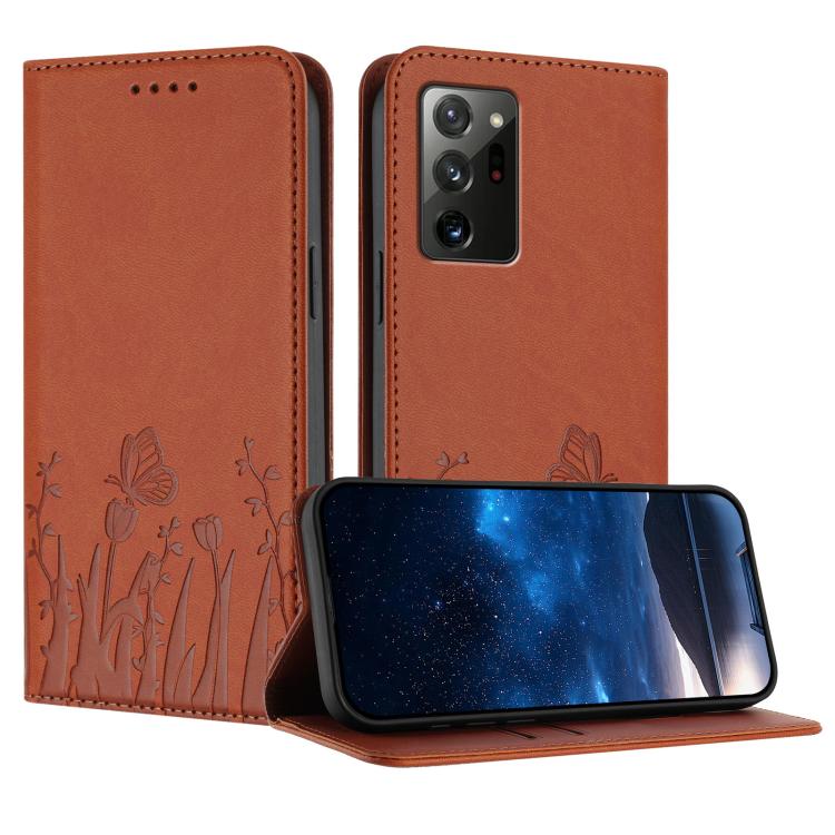 For Samsung Galaxy Note20 Tulips Butterfly Pattern Magnetic Vegan Leather Phone Case(Coffee)