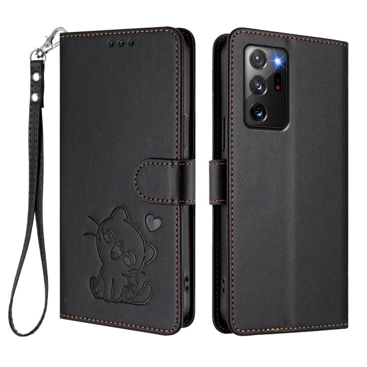 For Samsung Galaxy Note20 Ultra Embossed Heart Cat Leather Phone Case with Hand Strap(Black)