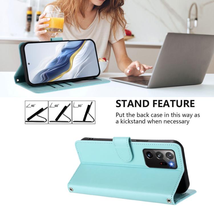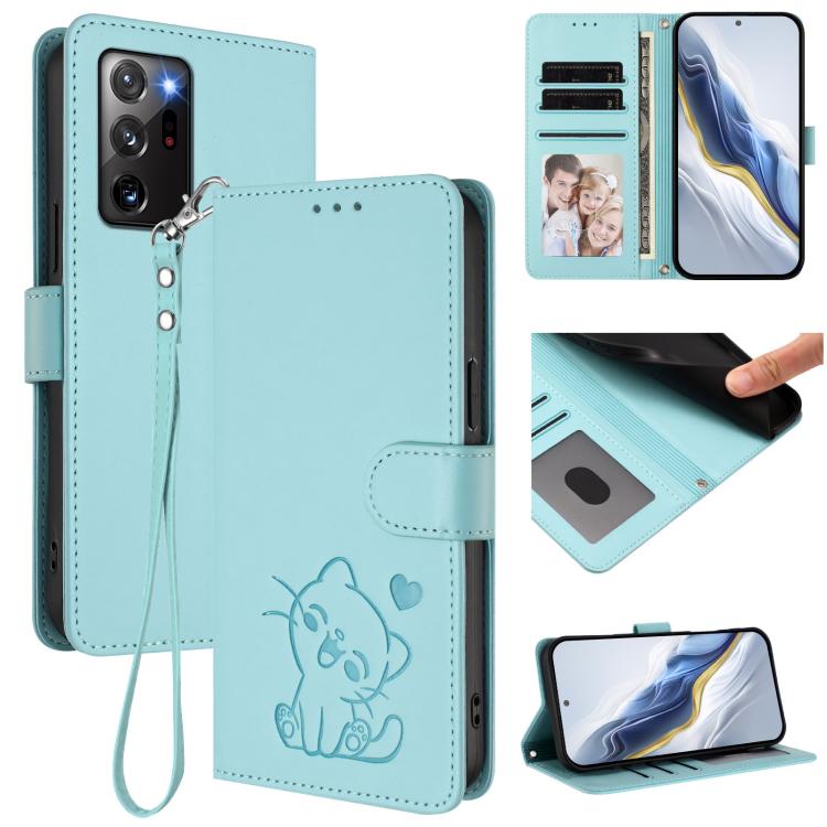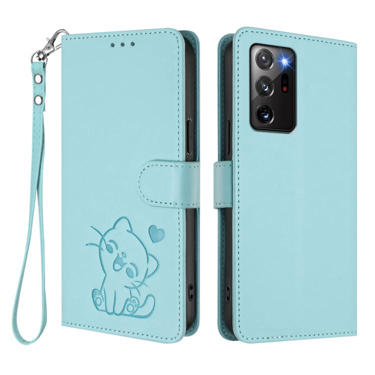 For Samsung Galaxy Note20 Ultra Embossed Heart Cat Leather Phone Case with Hand Strap(Mint Green)