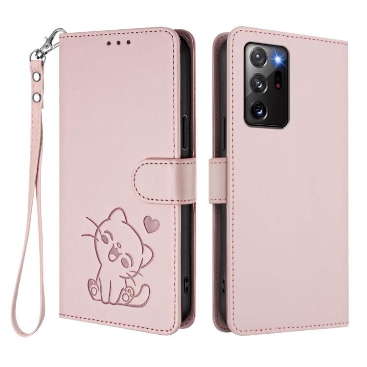 For Samsung Galaxy Note20 Ultra Embossed Heart Cat Leather Phone Case with Hand Strap(Pink)