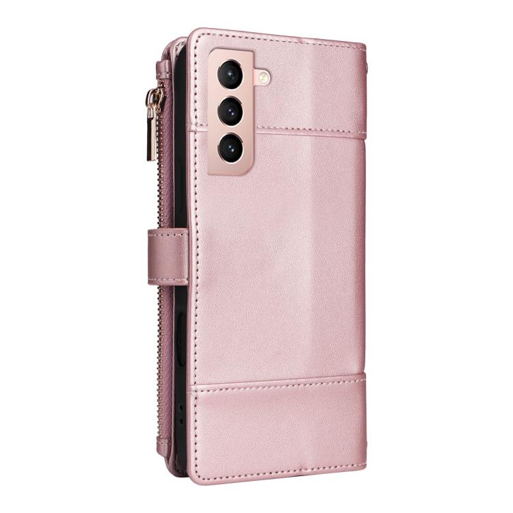 For Samsung Galaxy S21 5G Crossbody Strap RFID Blocking Zipper Wallet Leather Phone Case(Rose Gold)