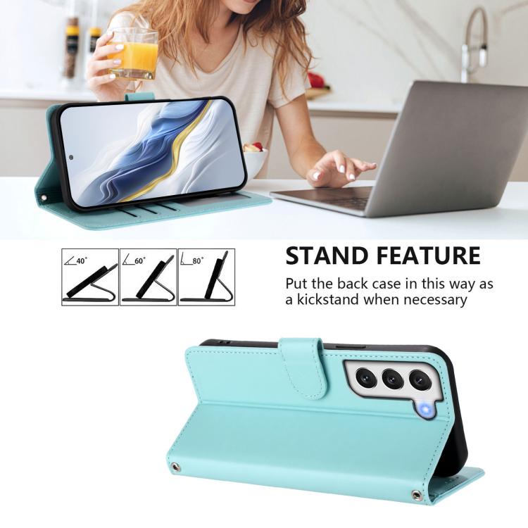 For Samsung Galaxy S21 5G Embossed Heart Cat Leather Phone Case with Hand Strap(Mint Green)