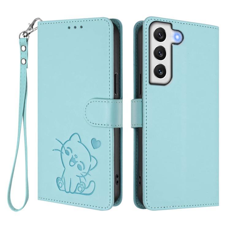 For Samsung Galaxy S21+ 5G Embossed Heart Cat Leather Phone Case with Hand Strap(Mint Green)