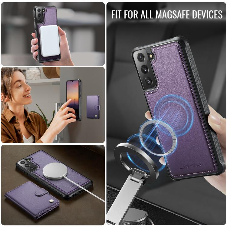For Samsung Galaxy S21 5G JEEHOOD J09 Buckle Card Bag MagSafe Magnetic Style RFID Leather Phone Case(Purple)