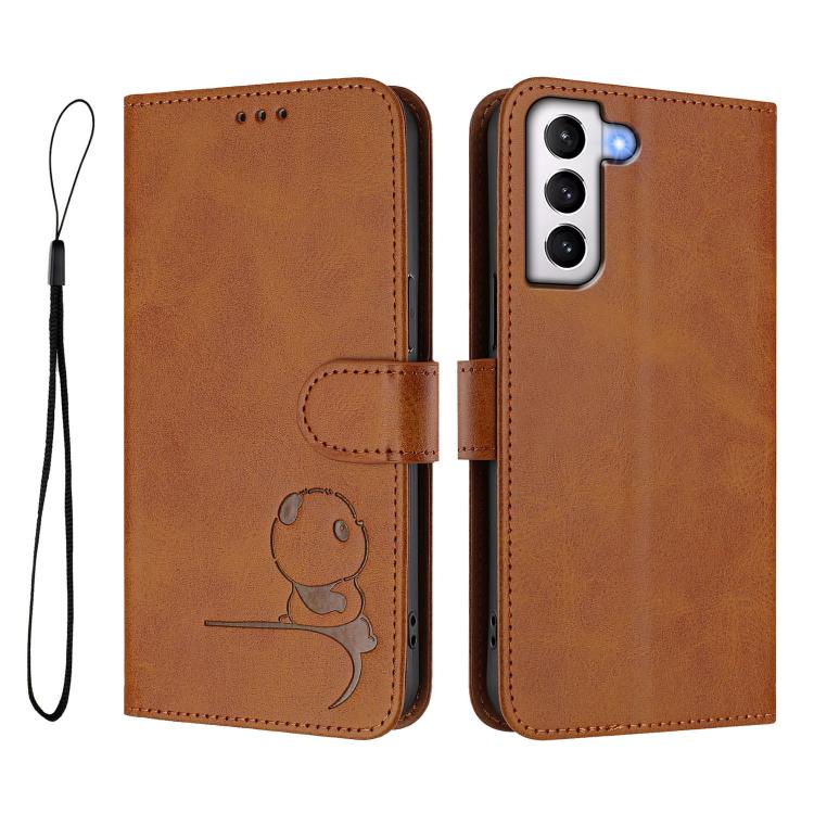 For Samsung Galaxy S21 5G Litter Panda Embossing RFID Leather Phone Case with Lanyard(Brown)