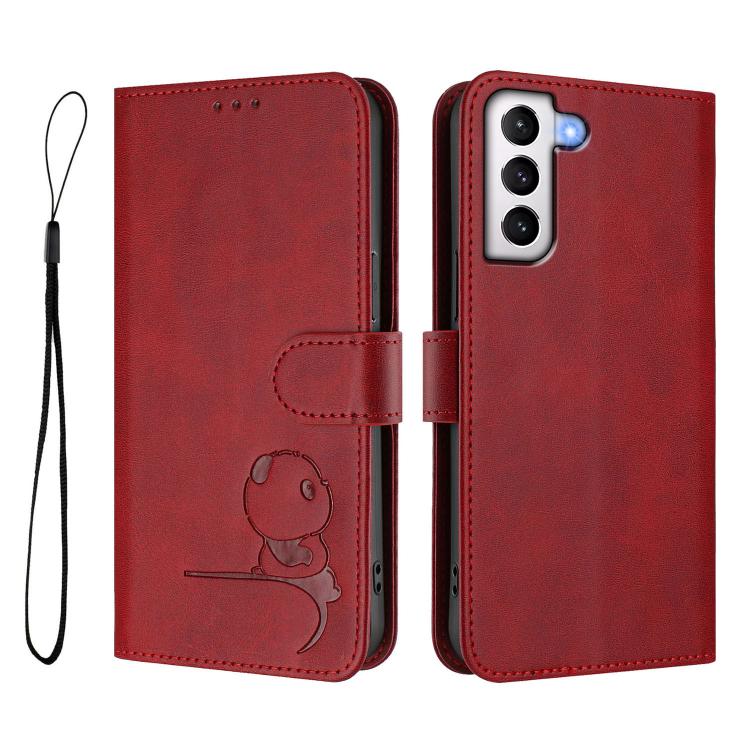 For Samsung Galaxy S21 5G Litter Panda Embossing RFID Leather Phone Case with Lanyard(Wine Red)
