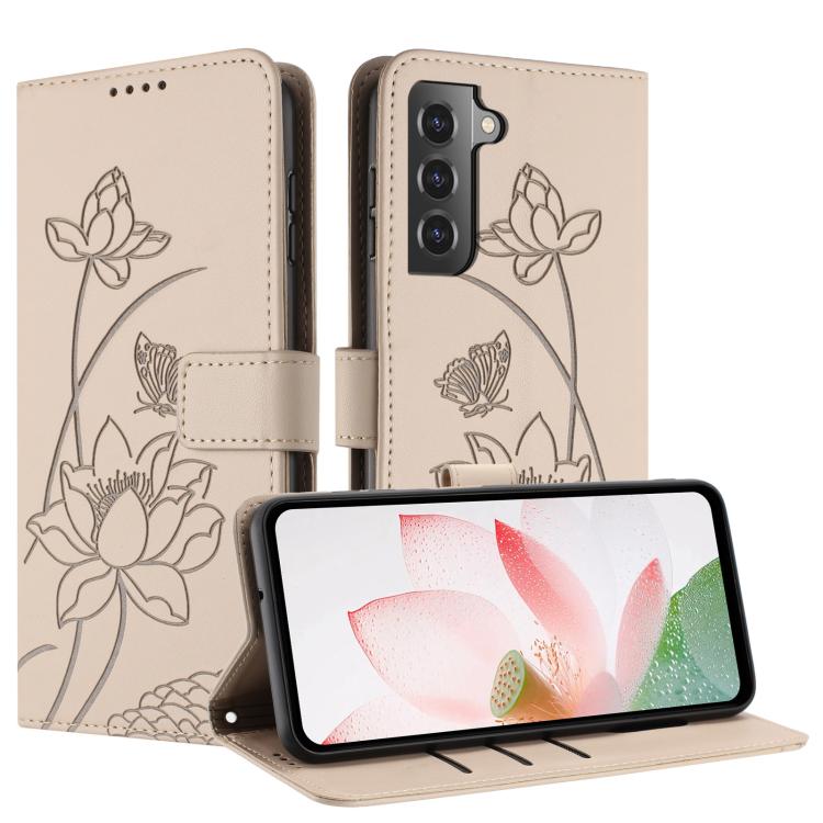 For Samsung Galaxy S21+ 5G Lotus Embossed Leather Phone Case with Lanyard(Beige)