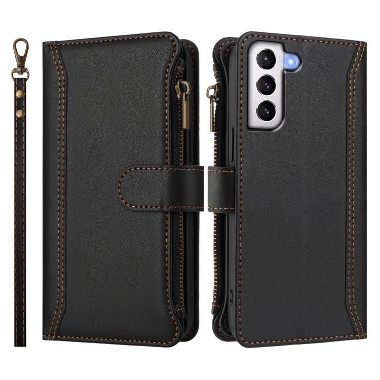 For Samsung Galaxy S21+ 5G Magnetic Closure 9 Card Slots Zipper Leather Case with Hand Strap(Black)