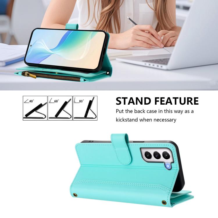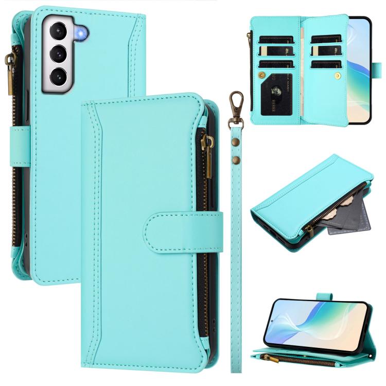 For Samsung Galaxy S21 5G Magnetic Closure 9 Card Slots Zipper Leather Case with Hand Strap(Mint Green)