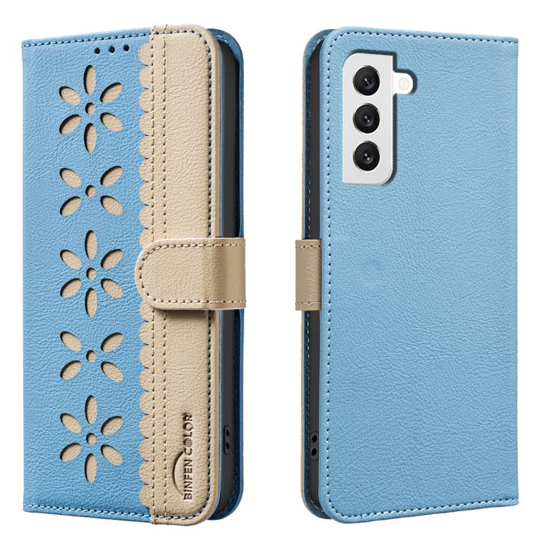 For Samsung Galaxy S21 5G Splicing Color Hollow Flower Pattern RFID Leather Phone Case(Baby Blue)