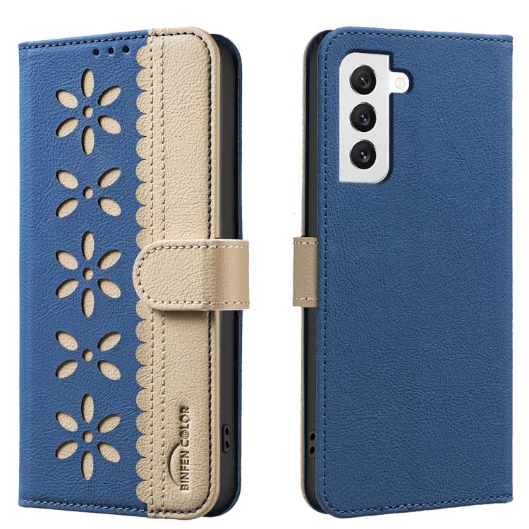 For Samsung Galaxy S21+ 5G Splicing Color Hollow Flower Pattern RFID Leather Phone Case(Dark Blue)
