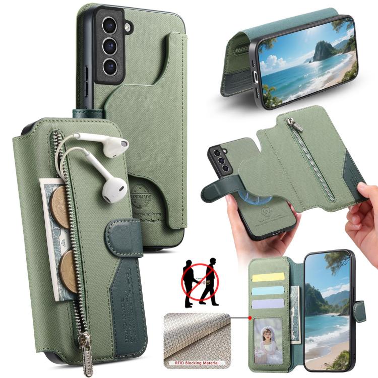 For Samsung Galaxy S21 5G Twill Fabric MagSafe RFID Anti-theft Zipper Wallet Leather Phone Case(Green)