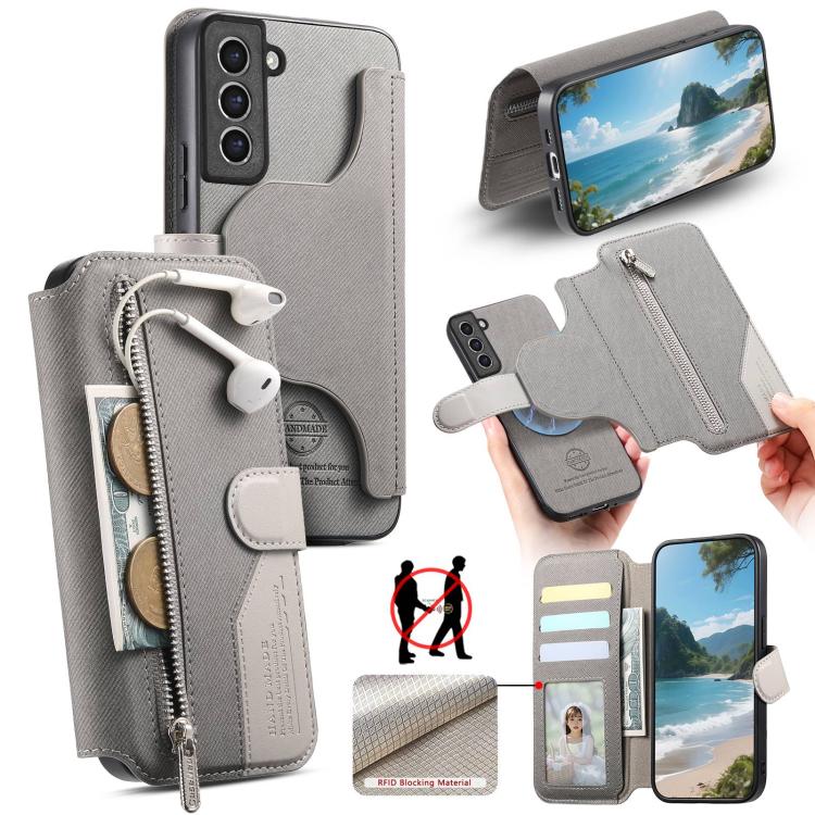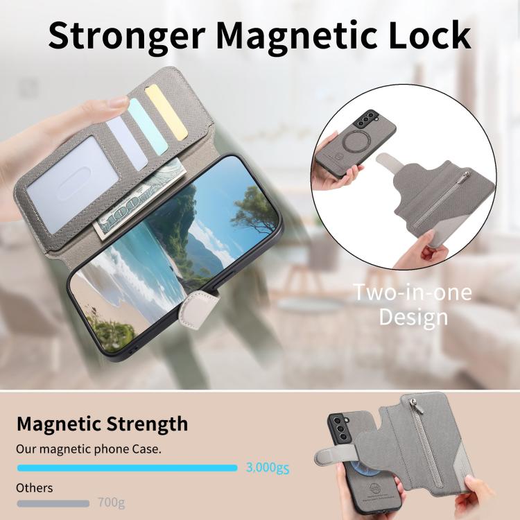 For Samsung Galaxy S21 5G Twill Fabric MagSafe RFID Anti-theft Zipper Wallet Leather Phone Case(Grey)