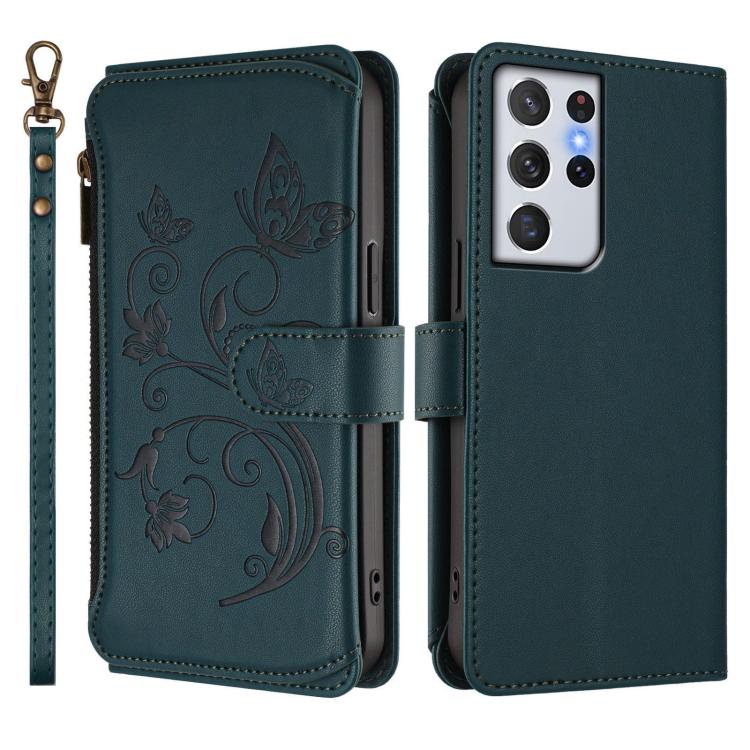 For Samsung Galaxy S21 Ultra 5G Butterfly Love Flower Multi-card Zipper Wallet Leather Phone Case(Dark Green)