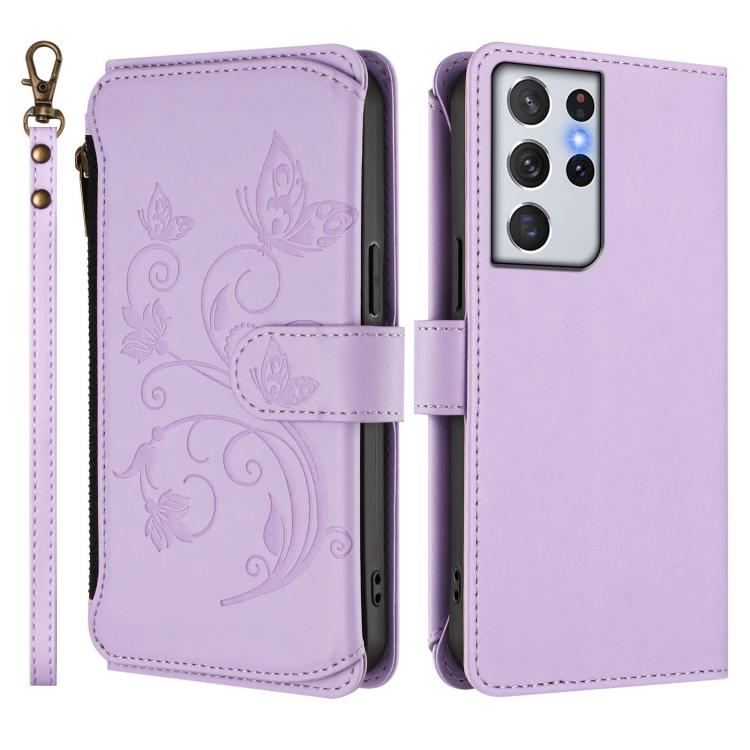 For Samsung Galaxy S21 Ultra 5G Butterfly Love Flower Multi-card Zipper Wallet Leather Phone Case(Light Purple)