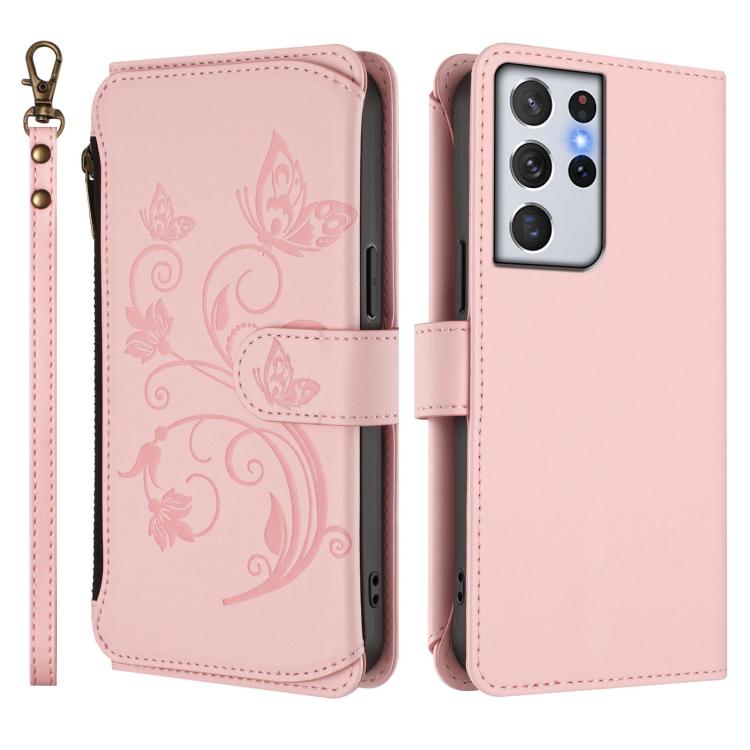 For Samsung Galaxy S21 Ultra 5G Butterfly Love Flower Multi-card Zipper Wallet Leather Phone Case(Pink)