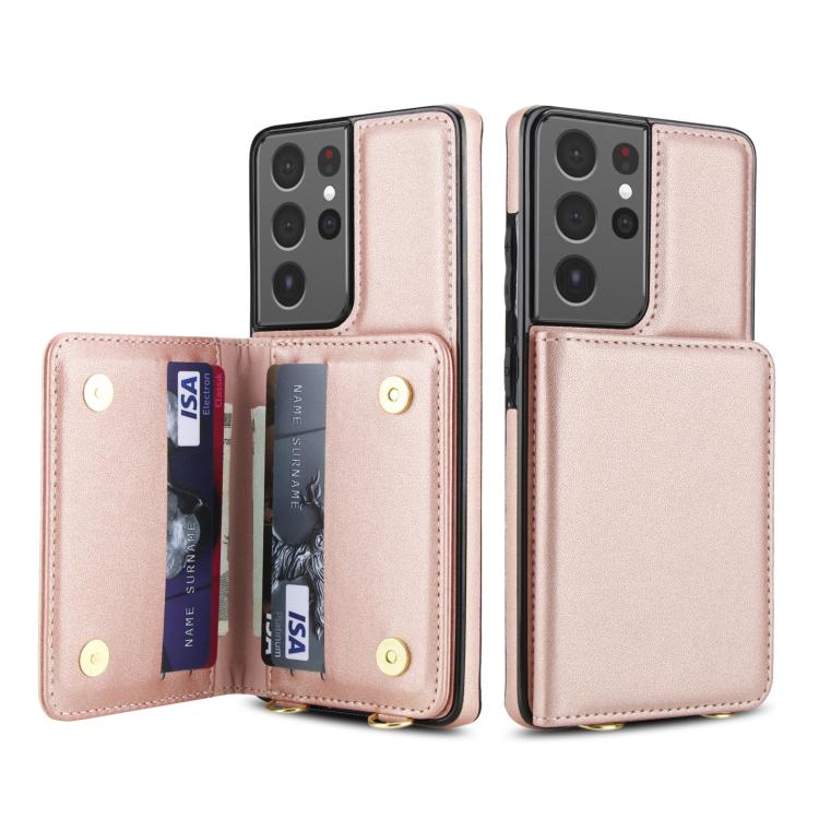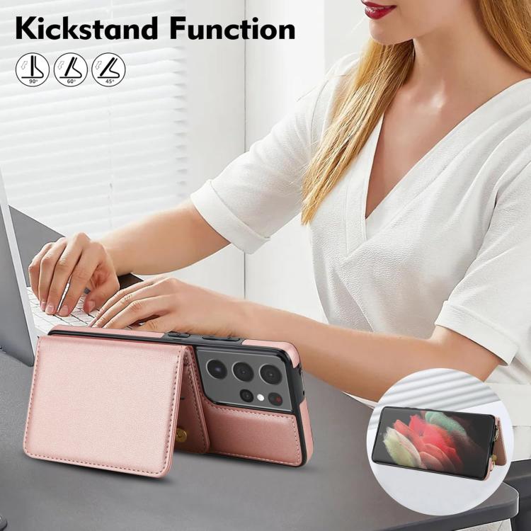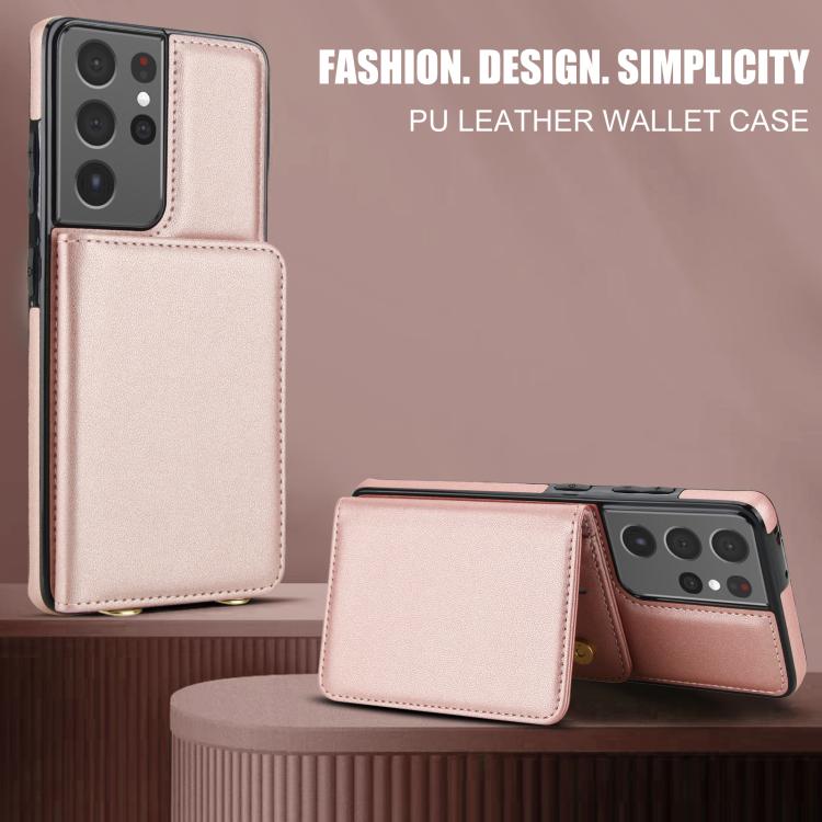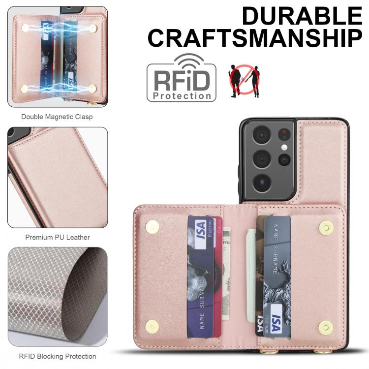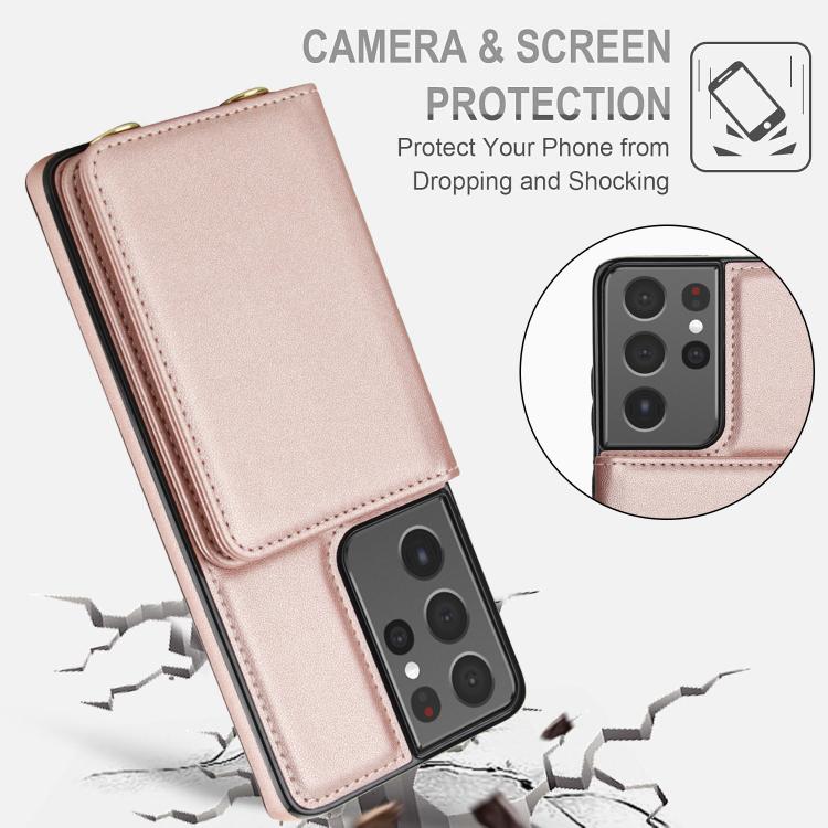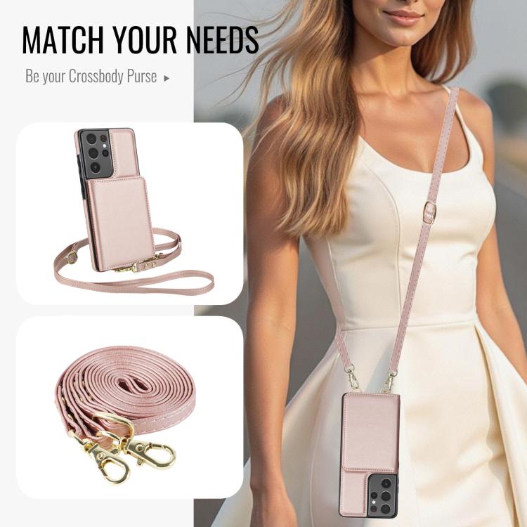 For Samsung Galaxy S21 Ultra 5G Crossbody Dual-buckle Wallet RFID Back Leather Phone Case(Rose Gold)