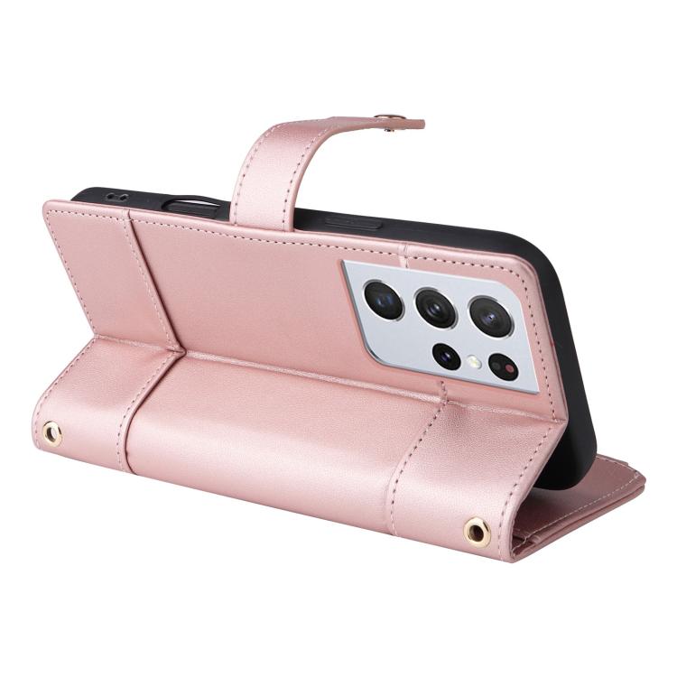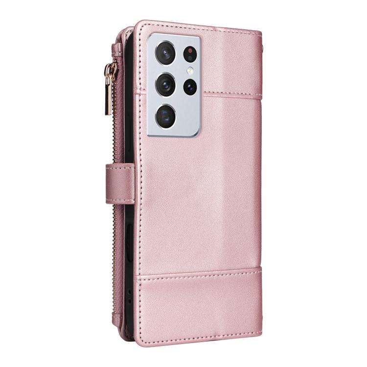 For Samsung Galaxy S21 Ultra 5G Crossbody Strap RFID Blocking Zipper Wallet Leather Phone Case(Rose Gold)
