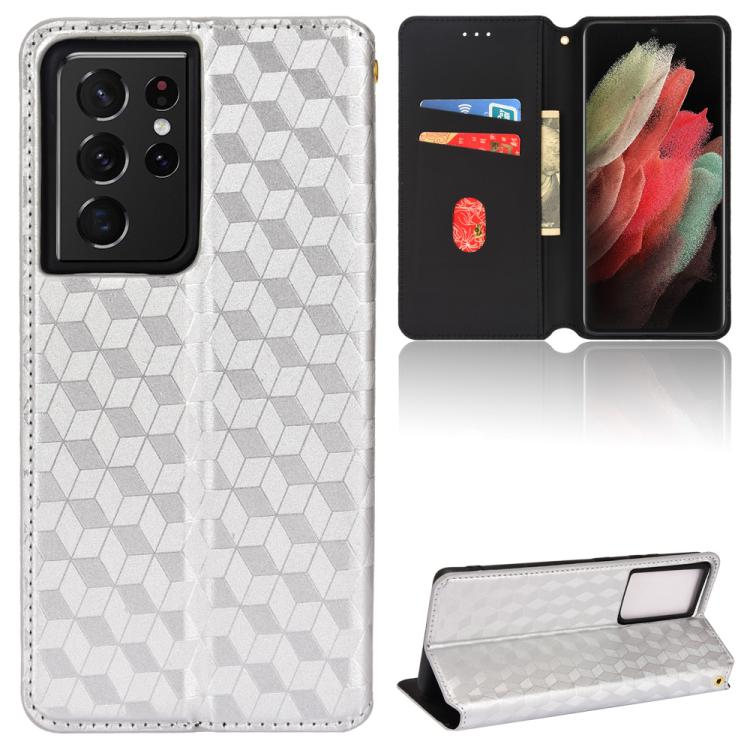 For Samsung Galaxy S21 Ultra 5G Cubic Grid Texture Flip Leather Phone Case(Silver)
