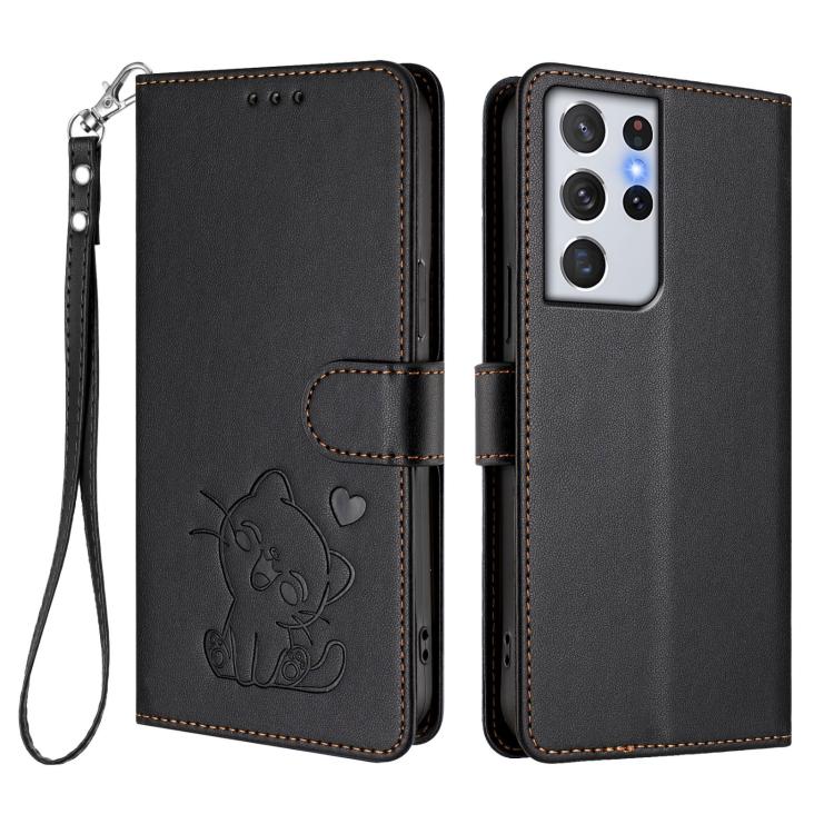 For Samsung Galaxy S21 Ultra 5G Embossed Heart Cat Leather Phone Case with Hand Strap(Black)