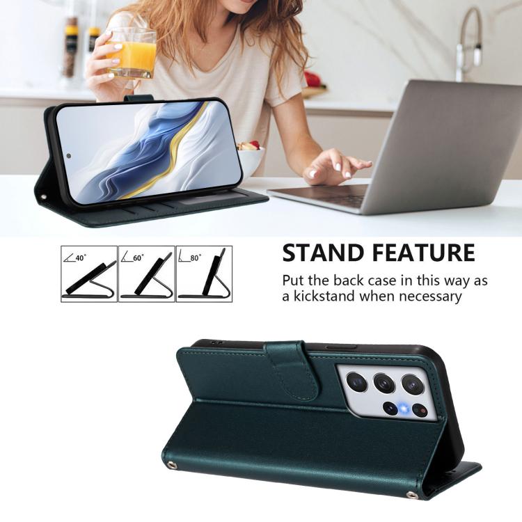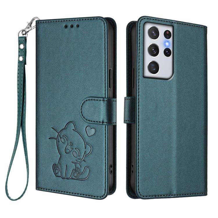 For Samsung Galaxy S21 Ultra 5G Embossed Heart Cat Leather Phone Case with Hand Strap(Dark Green)