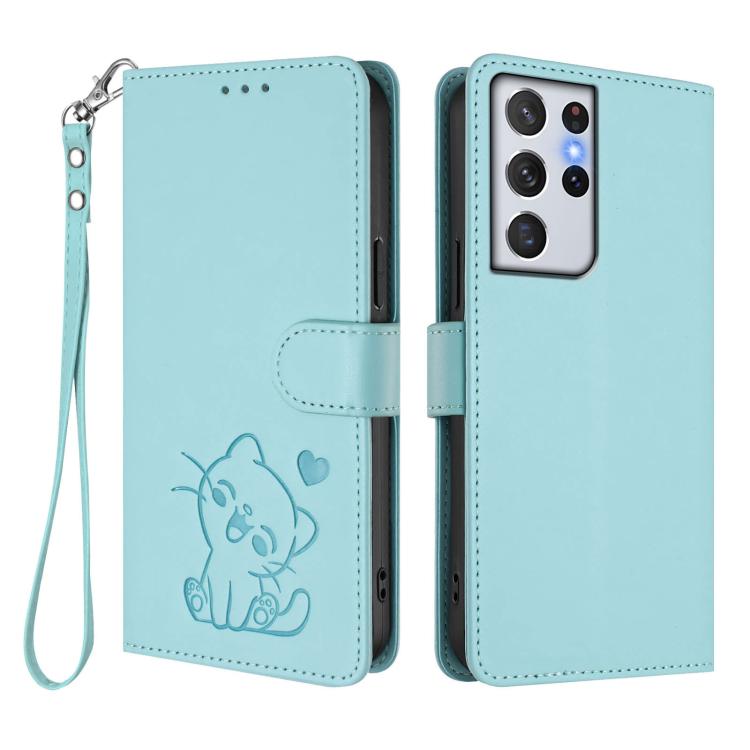 For Samsung Galaxy S21 Ultra 5G Embossed Heart Cat Leather Phone Case with Hand Strap(Mint Green)