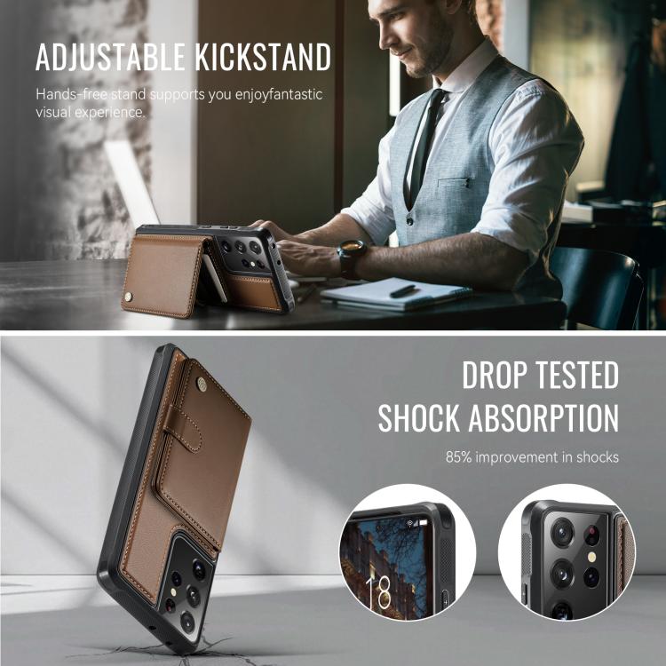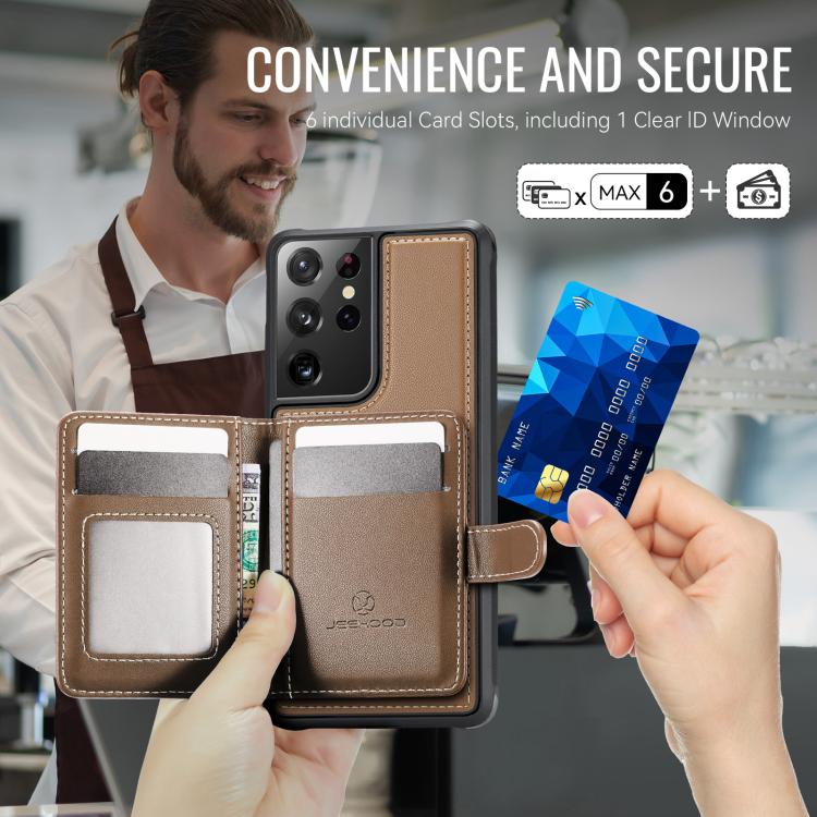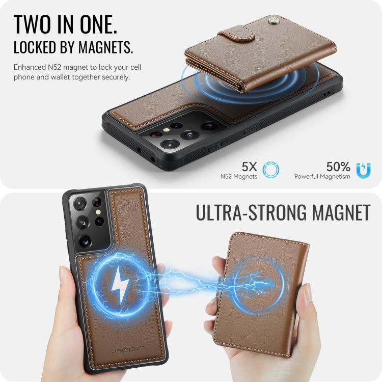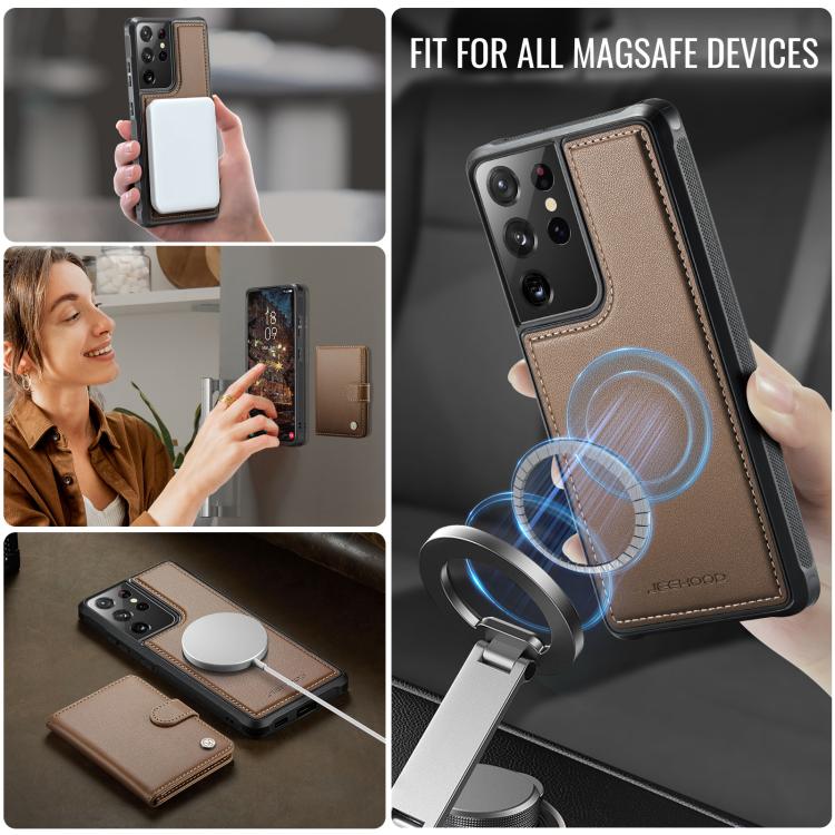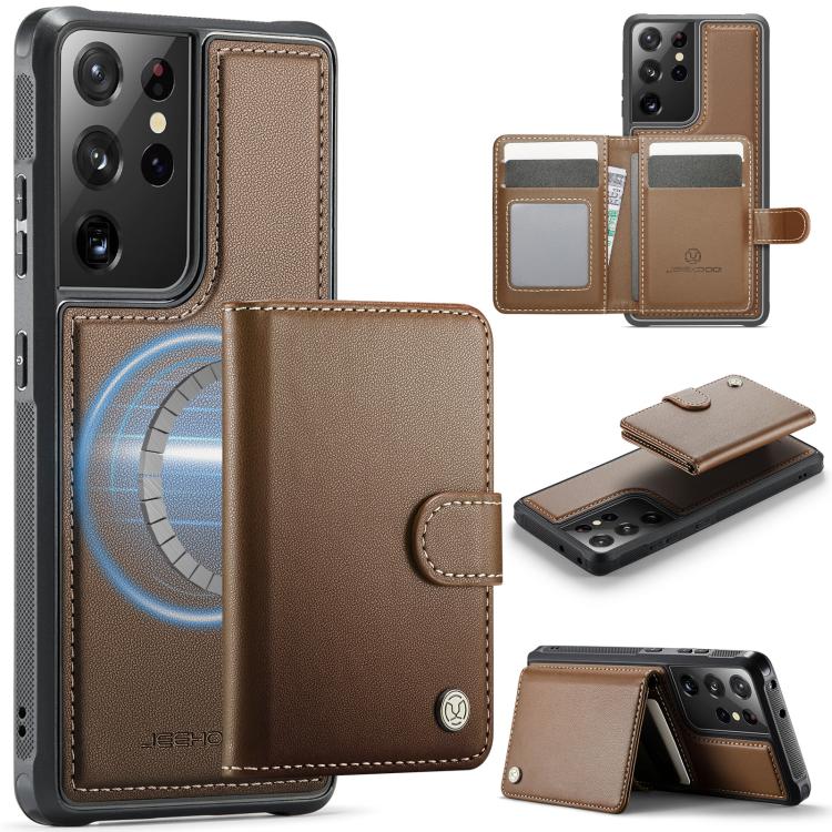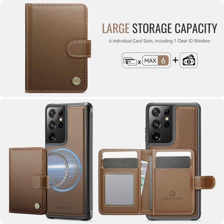 For Samsung Galaxy S21 Ultra 5G JEEHOOD J09 Buckle Card Bag MagSafe Magnetic Style RFID Leather Phone Case(Brown)