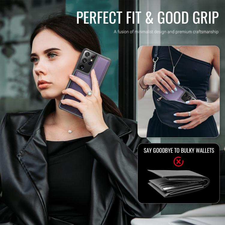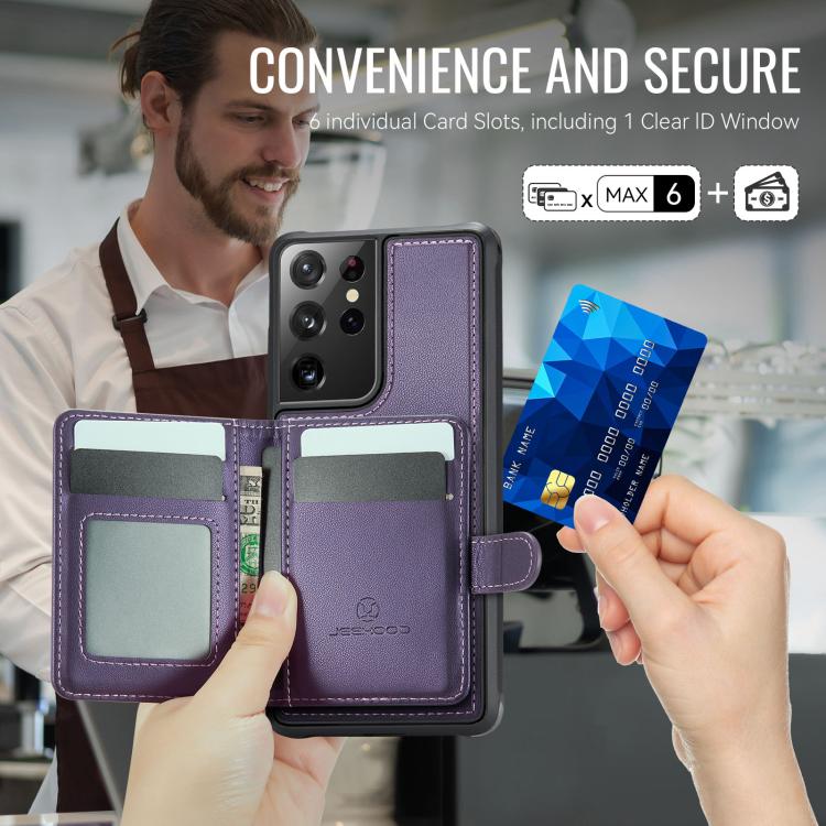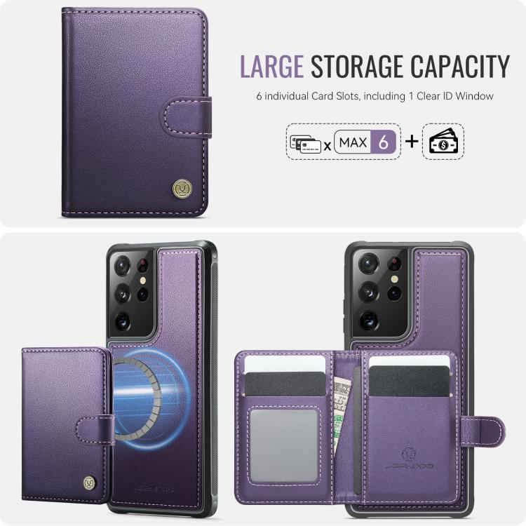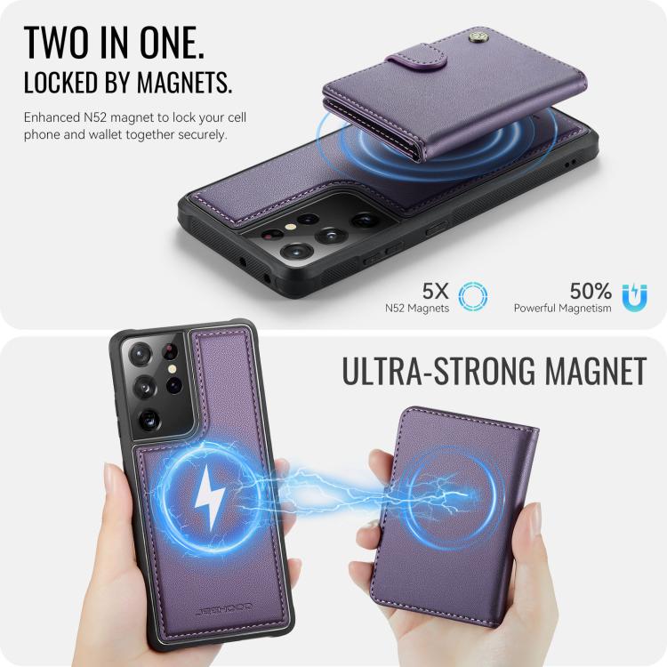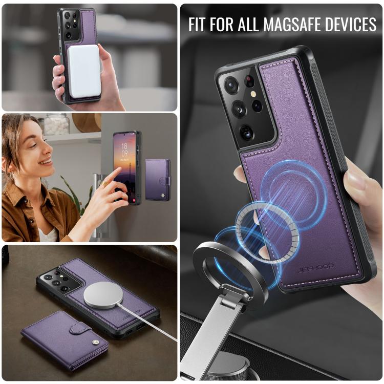 For Samsung Galaxy S21 Ultra 5G JEEHOOD J09 Buckle Card Bag MagSafe Magnetic Style RFID Leather Phone Case(Purple)
