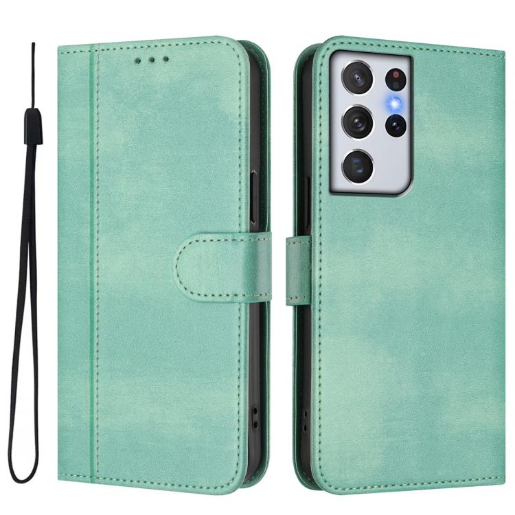 For Samsung Galaxy S21 Ultra 5G Line Splicing Buckle Retro Leather Phone Case(Mint Green)