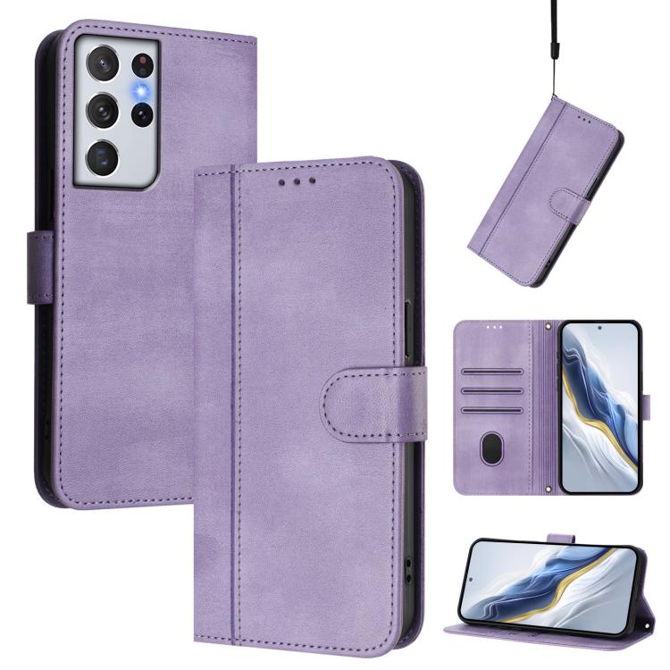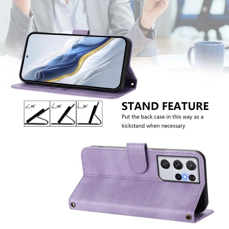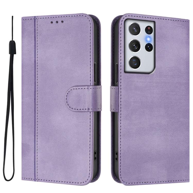 For Samsung Galaxy S21 Ultra 5G Line Splicing Buckle Retro Leather Phone Case(Purple)