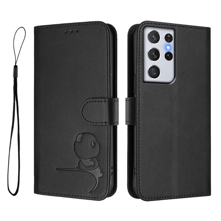 For Samsung Galaxy S21 Ultra 5G Litter Panda Embossing RFID Leather Phone Case with Lanyard(Black)