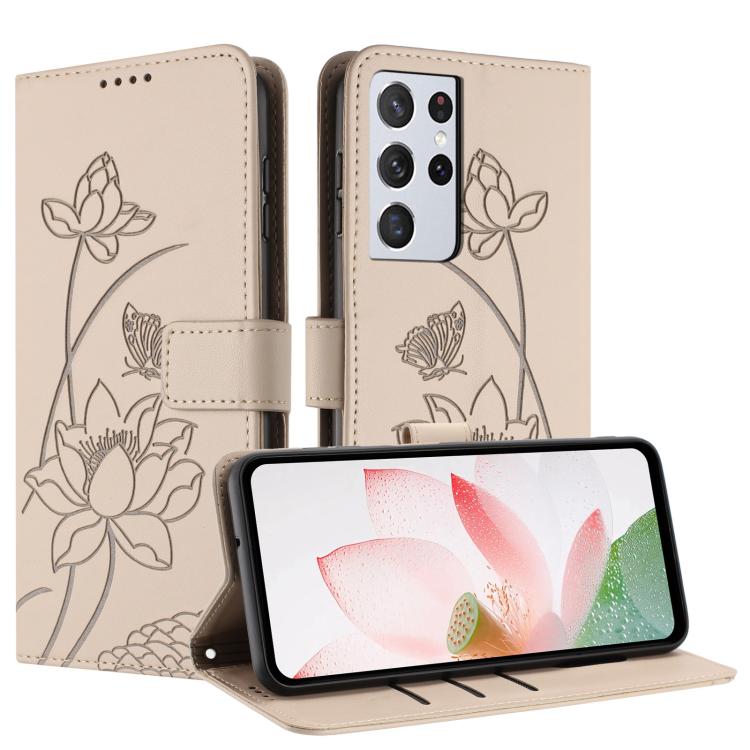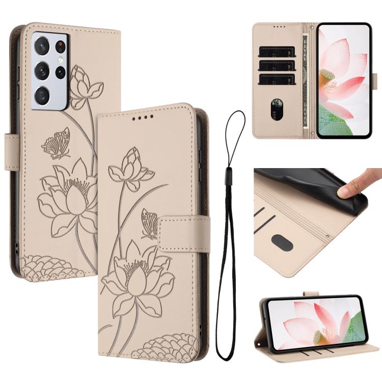 For Samsung Galaxy S21 Ultra 5G Lotus Embossed Leather Phone Case with Lanyard(Beige)