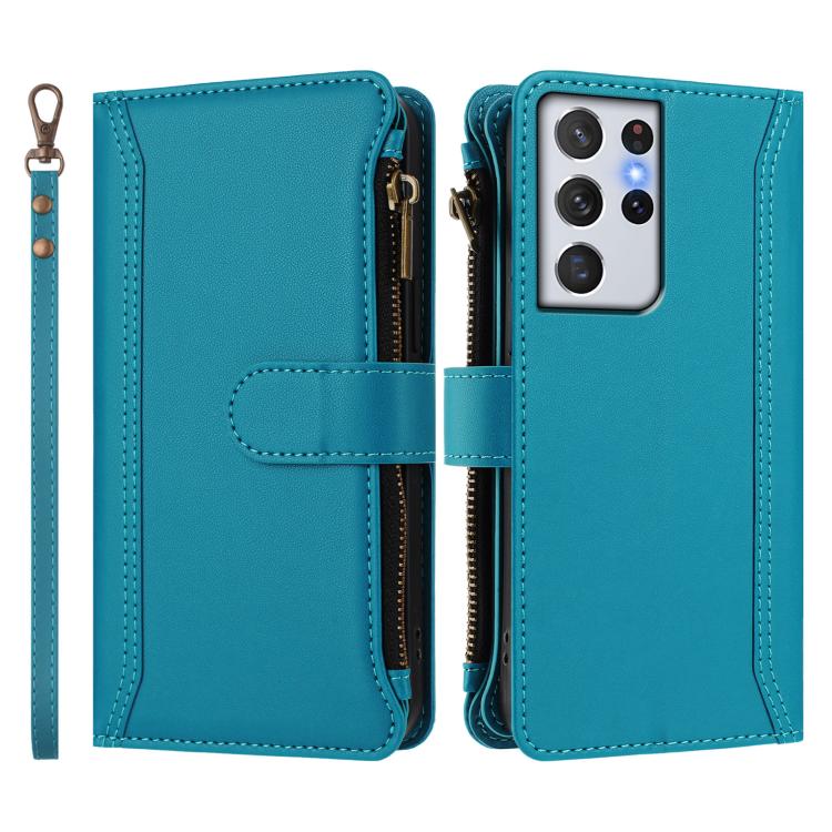 For Samsung Galaxy S21 Ultra 5G Magnetic Closure 9 Card Slots Zipper Leather Case with Hand Strap(Turquoise)