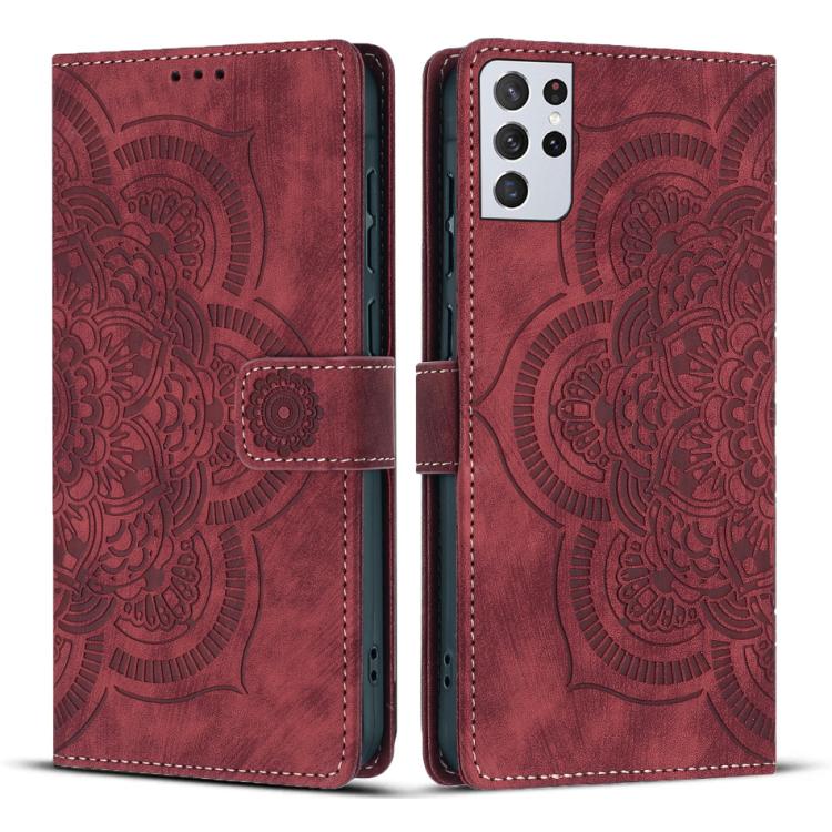 For Samsung Galaxy S21 Ultra 5G Mandala Embossed Retro Frosted Leather Phone Case(Red)