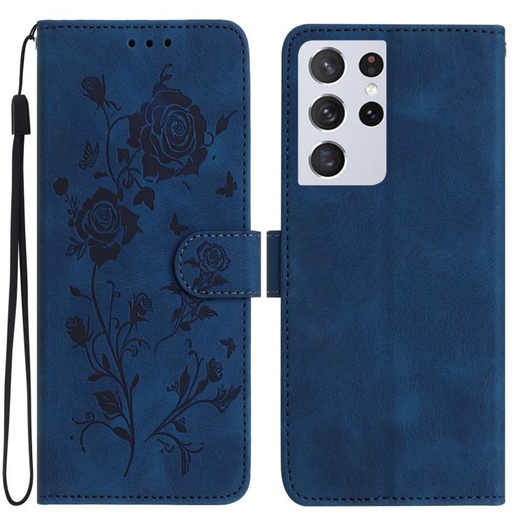 For Samsung Galaxy S21 Ultra 5G Rose Flower Embossing Pattern Leather Phone Case(Dark Blue)